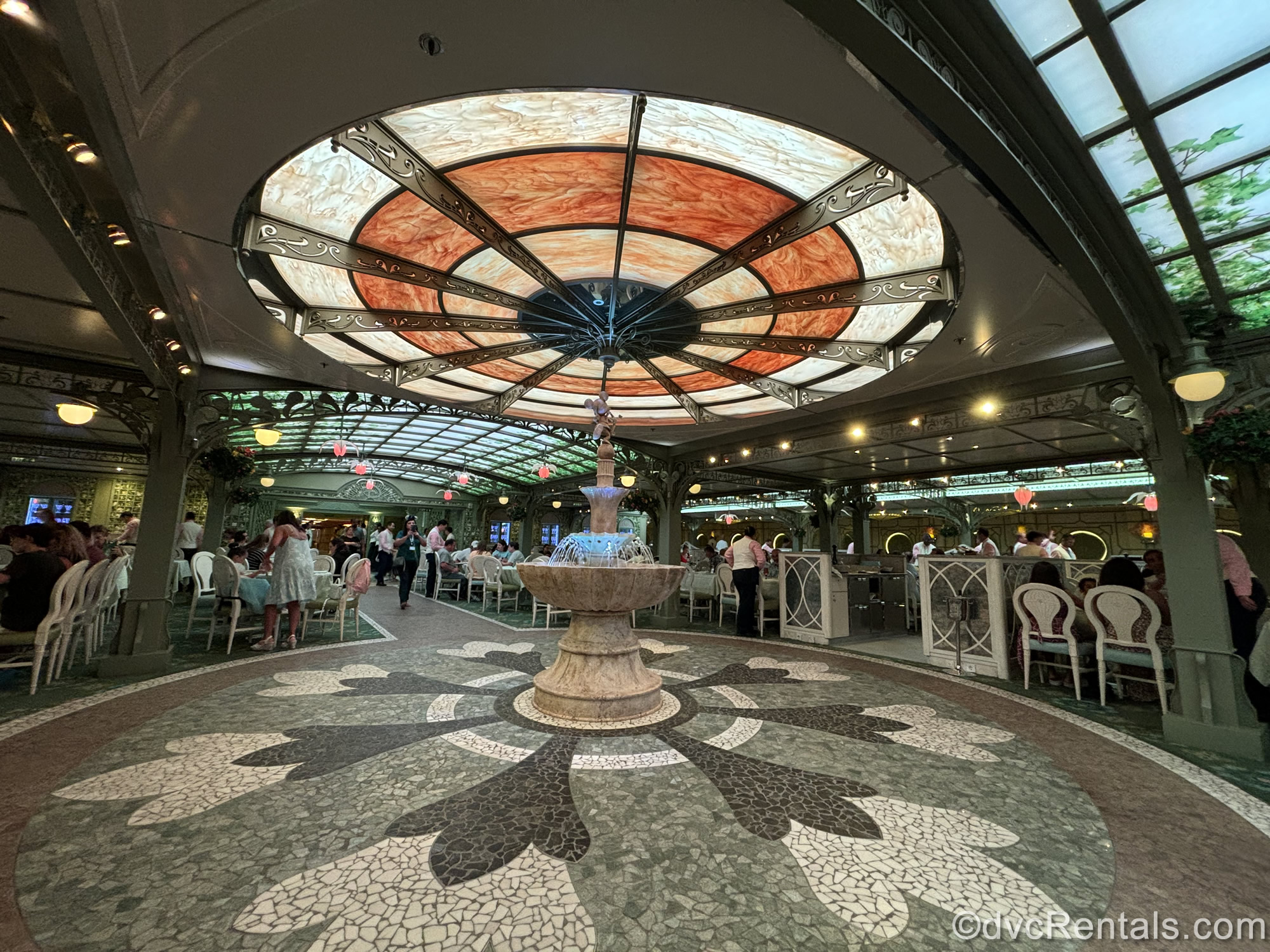 10 Posted: April 15, 2025 The interior of the Enchanted Garden dining room on the Disney Dream. There is a fountain with a stone Mickey Mouse figure at the top in the center of the room, and the décor is inspired by French gardens.