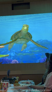 Crush from the film Finding Nemo chats with dinner guests at Animator’s Palate on the Disney Dream.