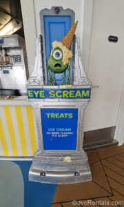 13 Posted: April 15, 2025 A silver and blue sign displays Mike Wazowski with an upside-down ice cream cone dripping down his head. The sign reads “Eye Scream Treats” in green writing and the soft serve machine can be seen in the background.