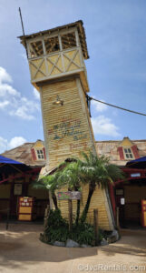 14 Posted: June 20, 2025 A wooden, yellow, clapboard tower with the words “Placid Palms Resort” on it in blue writing leans to the left in front of the building housing the Leaning Palms dining area.