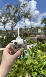 15 Posted: June 20, 2025 A hand holds up a cup of cookies and cream Dippin’ Dots ice cream at Disney’s Typhoon Lagoon Water Park under a blue sky.