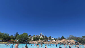 4 Posted: June 20, 2025 Guests swim in the Melt-Away Bay Pool at Disney’s Blizzard Beach under a blue sky. In the distance, Mount Gushmore and some of the park’s waterslides are visible.